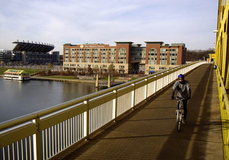 On the north side of Point Park, the Ft Duquesne Bridge crosses to the North Side. A bicycle/pedestrian ramp cantilevered from the downstream side provides an easy crossing from Point Park to the stadiums and science center on the North Shore