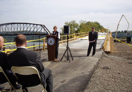 The challenge a safe trail crossing of the Monongahela River near McKeesport was resolved by rerouting the little remaining traffic that used the Riverton Bridge, abandoning the bridge for railroad use, and converting the bridge for trail use. The major conversion project was just being completed during the ribbon-cutting ceremony