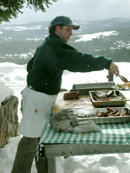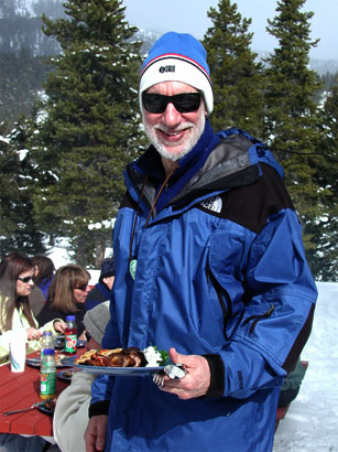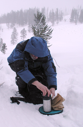 Mary and Roy, staying warm at lunch Chris, contemplating unbroken snow ahead Oscar -- more interested in hot soup than the camera