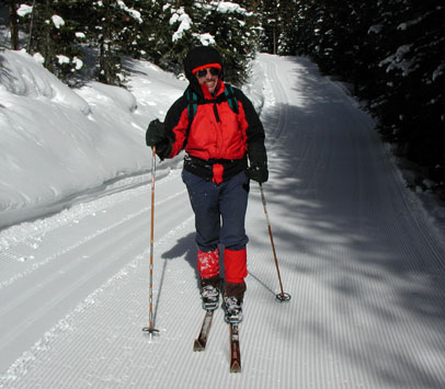 After 6-8 inches of overnight snow, eight of us took the wimpmobile to the upper trails, mostly to ski Mongolia and return via Boomerang and Dutch's Detour.