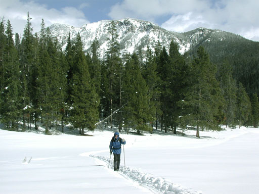 Knowing that whether we reached N45W111 would depend on snow conditions, existing trail, weather, how much debris from the 1988 burn was in the way, and other imponderables, Roy and I recruited our friend Oscar and Lone Mountain Guide Chris, and the four of us packed our climbing skins and set off for a day's skiing. The trip started off well -- on the drive to the trailhead we saw two moose, three young bighorm sheep, a couple of whitetail deer, a kingfisher, a duck, a raven, a herd of 60-80 elk, and two wolves! On the way home we topped off the critter count with a couple of coyotes.